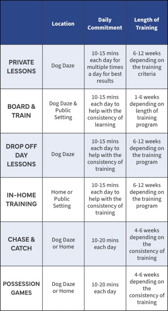 | Private Lessons | Board & Train | Drop off Day Lessons | In-Home Training | Chase & Catch | Possession Games | |